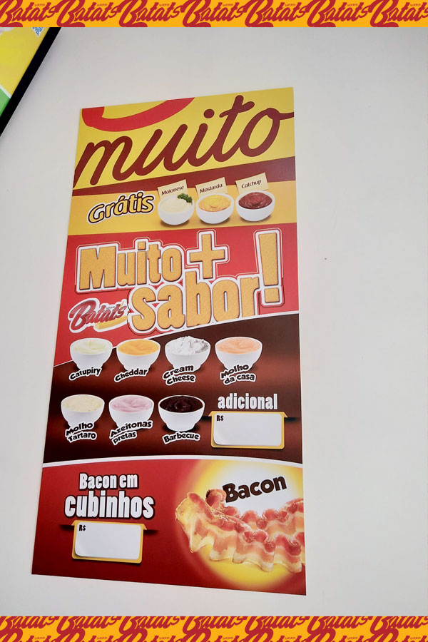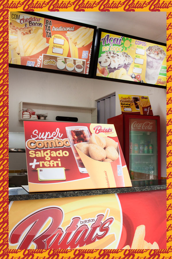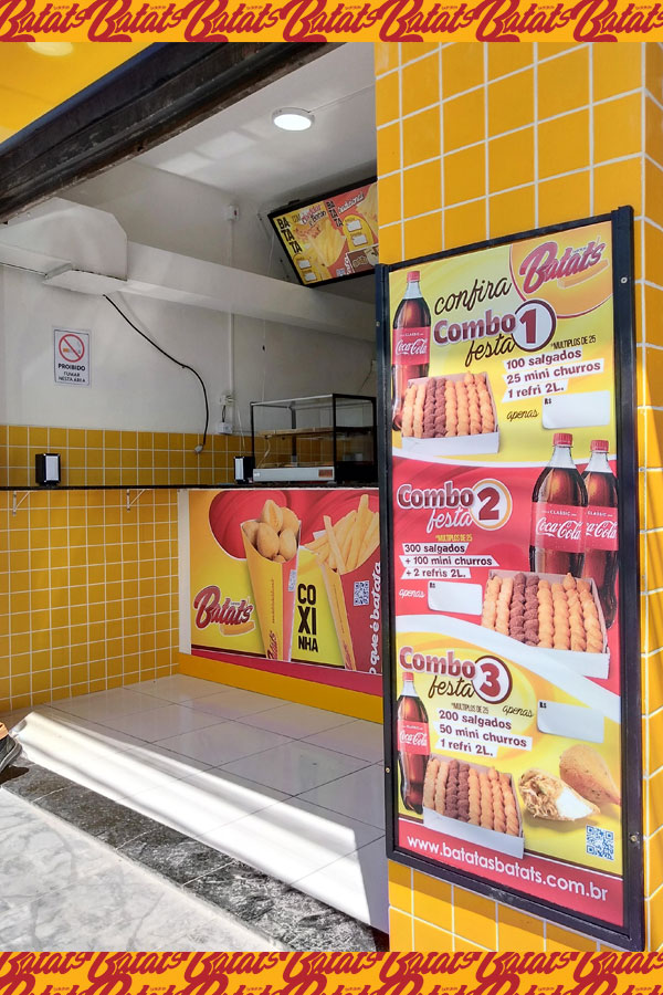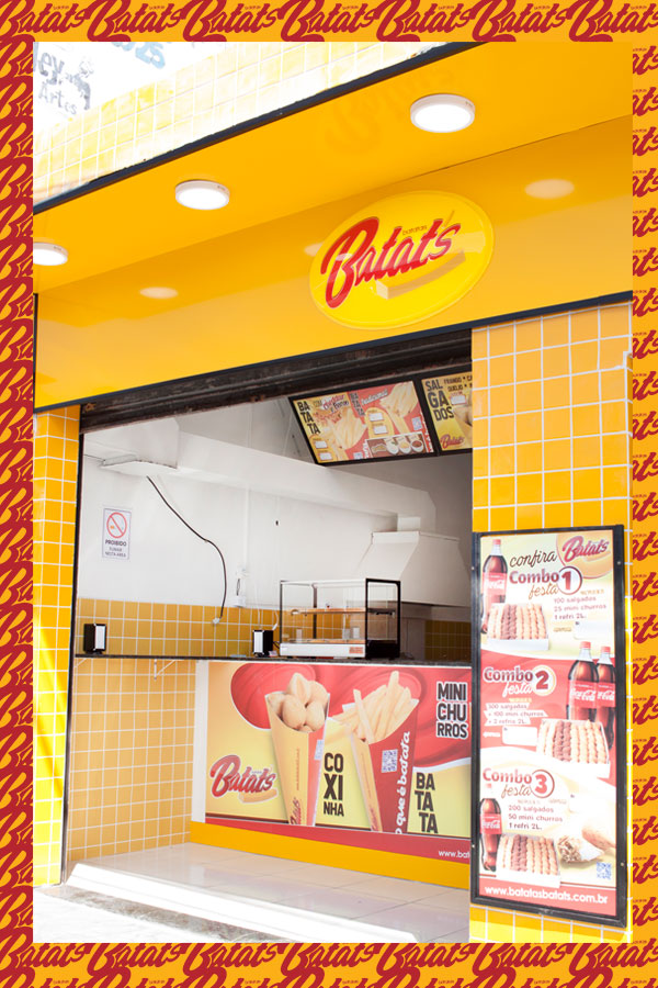 A sua Loja, Quiosque ou Mini Quiosque Batatas Batat's vende: Batata Frita no Cone (tradicional com molhos e especial com cheddar e bacon) • Mini Salgados (20g) de frango, presunto e queijo, calabresa, e queijo no Cone (cones M com 12 unidades de salgados) • Mini Churros (20g) de Doce de Leite, Chocolate, e Nutella no Cone (cones M com 12 unidades de Mini Churros) e • Bebidas (refrigerantes e sucos). Além dos Kits Festa e Combos de Salgados para Delivery.